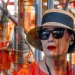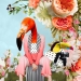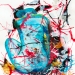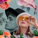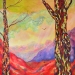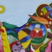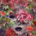 Abstract werk, collage op canvasboard. Hoofdkleuren oranje en roze.